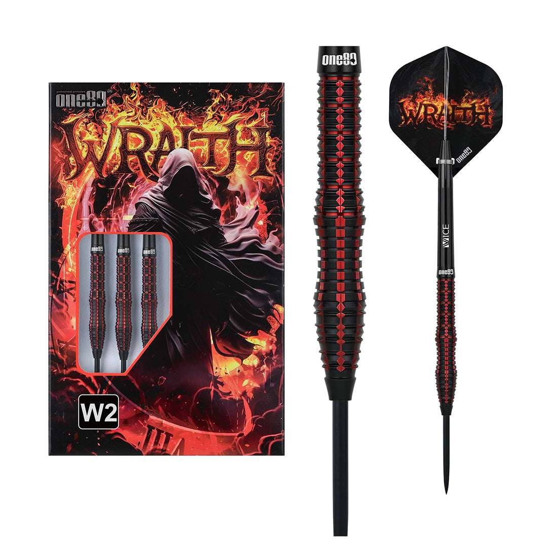 ONE80 Wraith W2 90% Steel Tip Darts enthält: 3 Darts, 3 Dartflights und 6 Dartschäfte.
