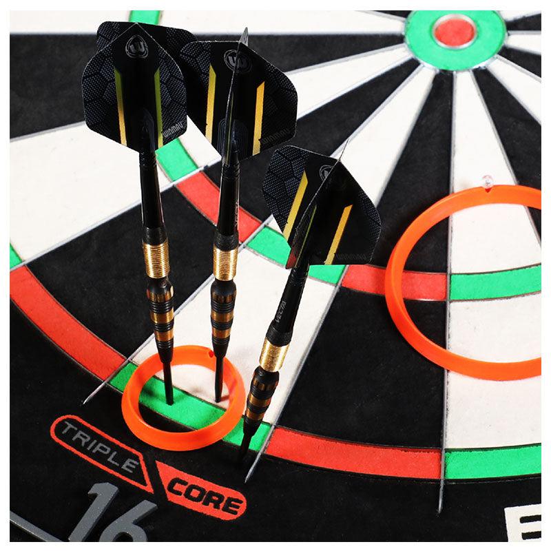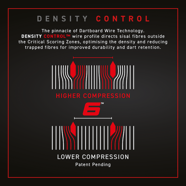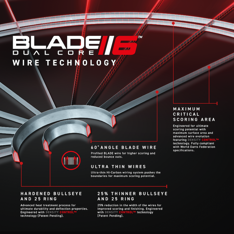 Die fein abgestimmten Innovationen von Blade 6 Dual Core sind ein Statement für Leistung und Qualität, das für den aufstrebenden Dartspieler gemacht wurde. Die patentierte Dual Core Dartboard-Basis bietet eine nahtlose, gut sichtbare Spielfläche und eine optimierte Kerndichte, die für maximales Scoring ausgelegt ist. Reduzierte Dichte am äußeren Kern erleichtert das Eindringen der Pfeile, während der hochdichte innere Kern überschüssige kinetische Energie absorbiert und so die Zurückhaltung und Haltbarkeit der Pfeile optimiert. Das bahnbrechende Webdesign von Blade verfügt über den neuesten „Density Control™“-Draht für optimale Faserdichte und verbesserten Abnäherrückhalt in den Doppel-, Drillings- und Bullseye-Zonen für maximale Scoring-Power. Der ultradünne 60° abgewinkelte Draht lenkt Darts in den Scoring-Bereich für absolut minimale Bounce-Outs. Das vollständig gehärtete Bullseye und der Outer Bull mit „Density Control™“-Draht sind jetzt 25 % dünner. Ausgestattet mit dem leicht einstellbaren Rota-Lock-Montagesystem passt der Blade 6 Dual Core an jede Wand, sodass Sie innerhalb von Minuten mit dem Spielen beginnen können. Hergestellt aus feinstem ostafrikanischem Sisal für die anspruchsvollsten Spieler und Umgebungen. Blade 6 Dual Core ist für professionelle Turniere zugelassen und wird nach den offiziellen Spezifikationen der World Darts Federation hergestellt.