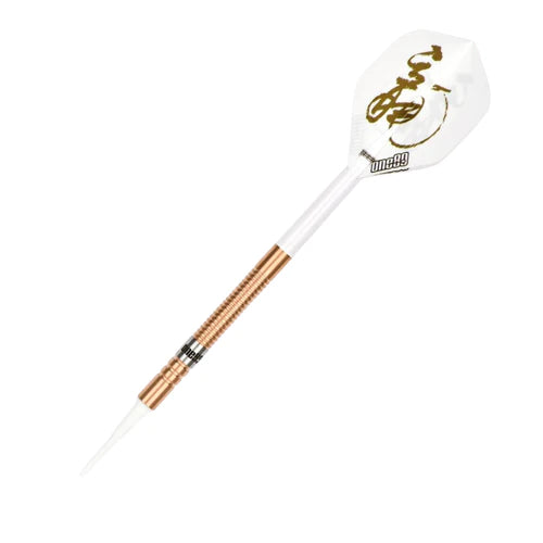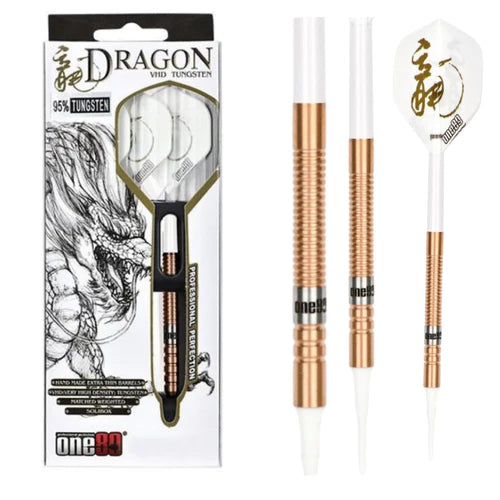 The One80 Fire Dragon Softip darts are made of very high-density tungsten, which allows for an extra compact shape. Each dart has a special bronze FIRE coating. Thanks to the Hand Made Extra Thin Barrels, every dart is unique. A set of Solibox and nylon shafts as well as a set of Dragon Flights are included in the delivery.