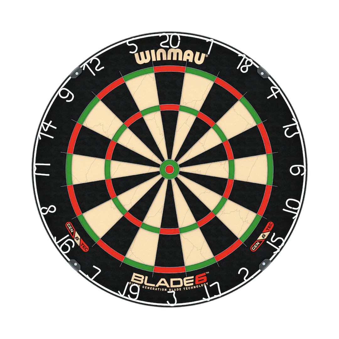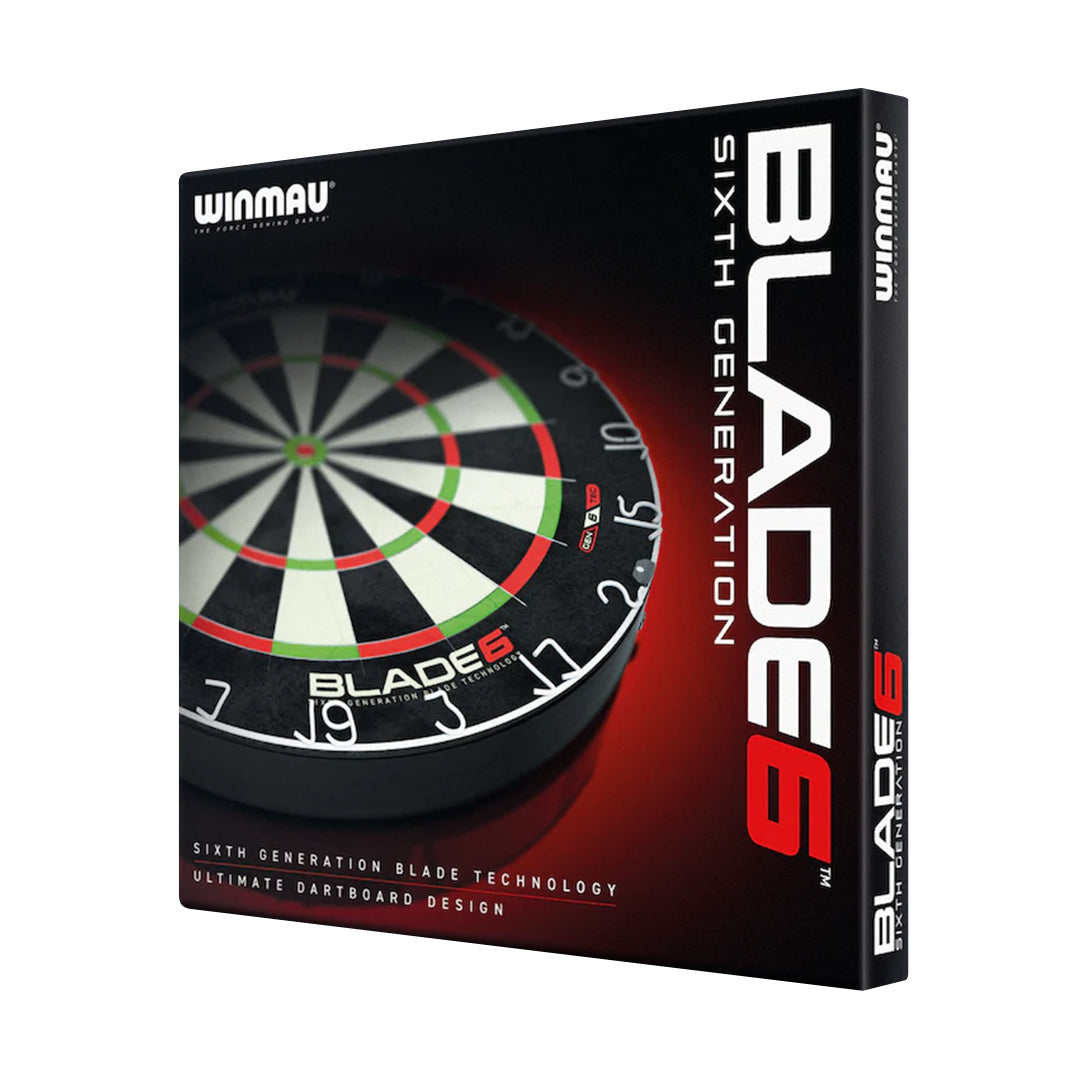 The Blade 6 Triple Core dartboard is the most technically advanced dartboard on the market and the culmination of 30 years of technical innovation. The revolutionary triple-core sisal base complements the sixth generation blade technology and offers the ultimate combination for optimal fiber density and maximum score. The Triple Core Carbon features an all new patented system with a seamless playing surface and a third, highly compressive layer of carbon fiber reinforced sisal. The ultimate dartboard construction with optimal fiber density, unrivaled dart retention and maximum scoring. Rounded out with brand new graphics and the world's first laser-cut anti-glare number ring for the ultimate gaming experience. Blade's groundbreaking weave design features the latest Density Control™ wire for optimal fiber density and improved dart retention in the doubles, trebles and bullseye zones for maximum scoring power. The ultra-thin 60° angled wire directs darts into the scoring area for absolutely minimal bounce-outs. The fully hardened Bullseye and Outer Bull with Density Control™ wire are now 25% thinner. Featuring the easily adjustable Rota-Lock mounting system and including the Spirit Master leveling tool, the Blade 6 Triple Core will fit any wall so you can be playing in minutes. Constructed from the finest East African sisal for the most demanding players and environments. Blade 6 Triple Core is engineered to the official specifications of the World Darts Federation and is recognized by the world's top professionals. A giant leap in dartboard design, the Blade 6 Triple Core is the hallmark of Winmau's 75 year dartboard heritage.
